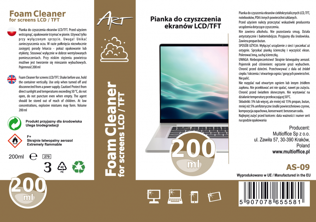 PIANKA CZYSZCZĄCA DO EKRANÓW LCD/TFT 200ml AS-09 ART